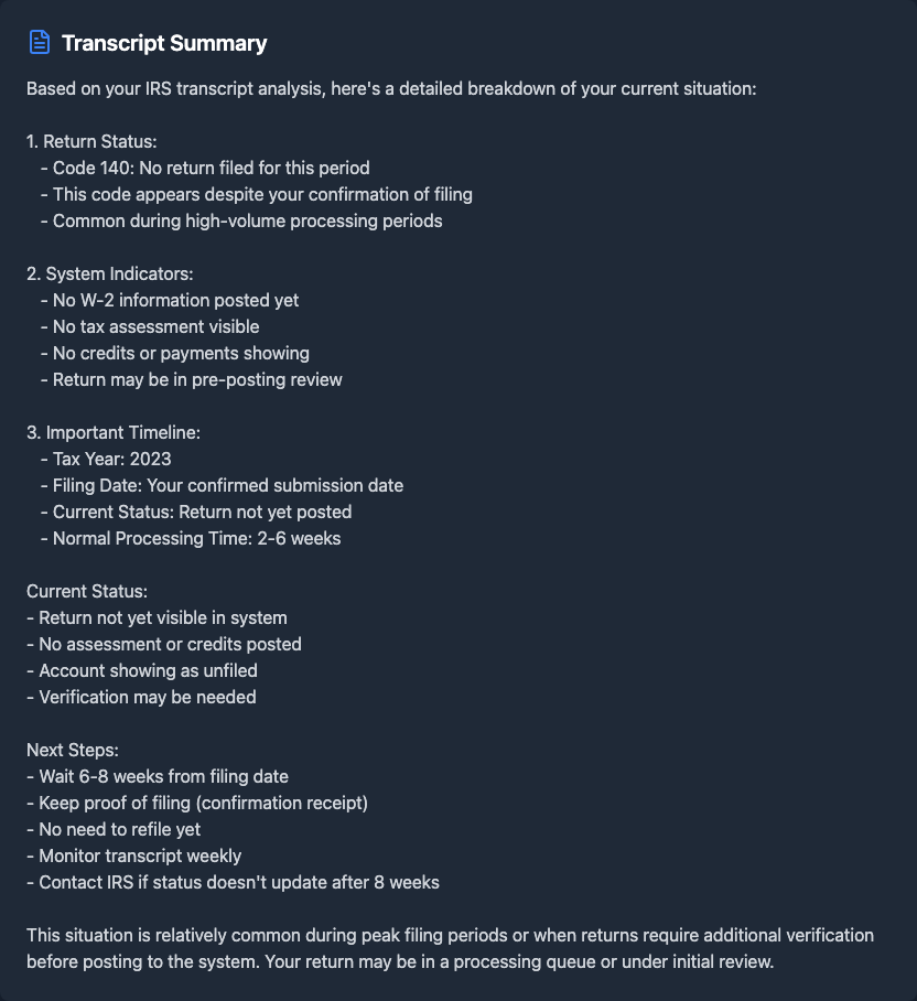 •Just used taxr.ai and here's what I got back: The AI found my return was actually received but stuck in ID verification. Would've never known that from just looking at my transcript!