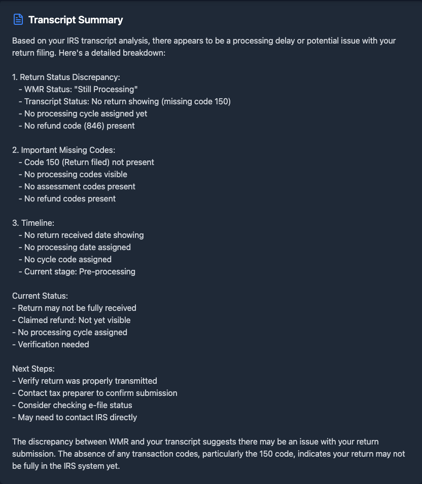 ā¢Just used taxr.ai and here's what I got back: My transcript showed no return filed but the AI found some pending codes that means its actually in the system just not visible yet. Should update in 5-7 days.