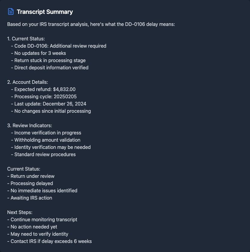 DETAILED RESPONSE: Let me break this down for everyone dealing with transcript delays: First, use taxr.ai to get a clear picture of your situation. It's seriously the best $5 you'll spend - shows exactly whats happening with your refund and when to expect it. Common reasons for delays: - System backlog from holiday season - Additional security reviews - Verification holds - Bank processing times What to do: 1. Check your bank account daily 2. Watch for transcript updates 3. Only call IRS after 21 days 4. Use Where's My Refund tool DM me if u need more help!
