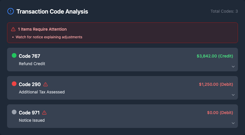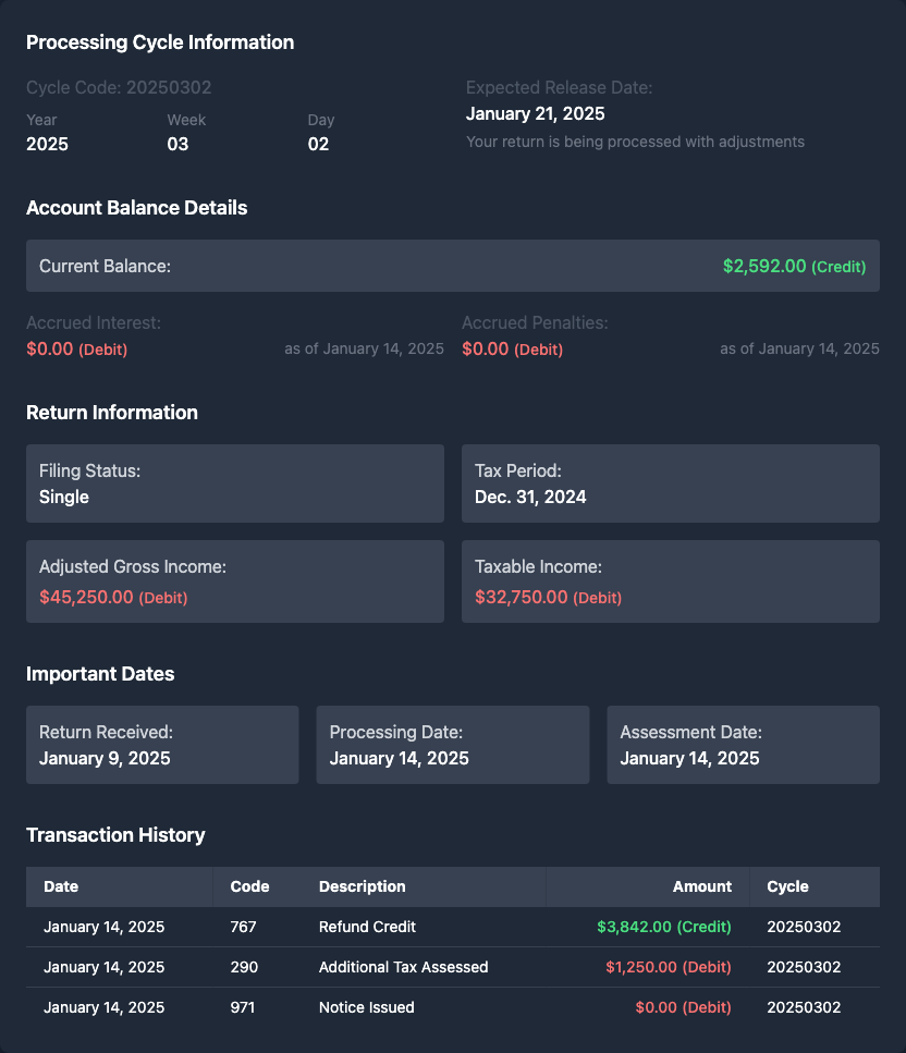 •Thank you for explaining this so clearly! I've been stressing about these codes for days and seeing multiple people say the same thing about the 767 being a correction really puts my mind at ease. The fact that my account balance is still showing -$6,595 gives me hope that I'll actually get that amount. I had no idea what the 290 with $0 meant - knowing it's just a processing marker and not actual tax owed is such a relief! Now I know what to look for with that 846 code. Fingers crossed it shows up in the next update! 🤞
