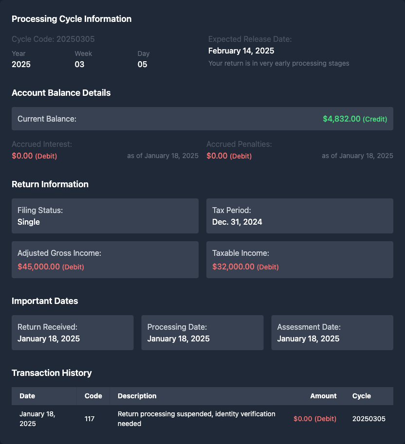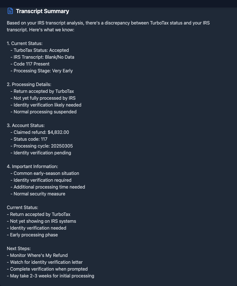 •Just used taxr.ai and here's what I got back: It spotted that my 117 code is actually a good sign - means return was accepted without any immediate red flags. Says I should see transcript movement by next Friday!
