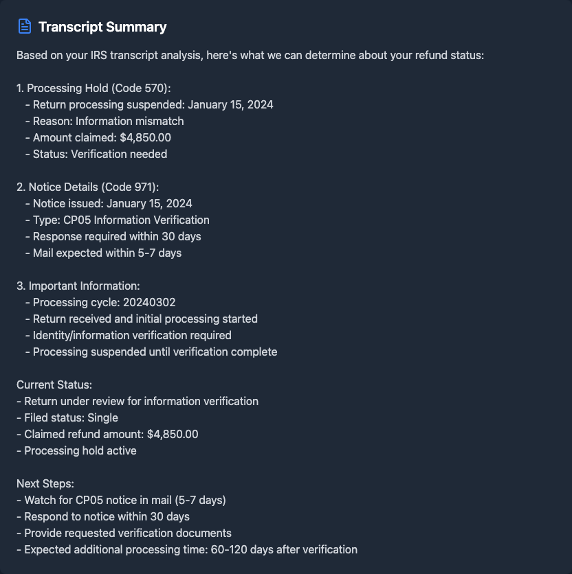 •it basically analyzes all ur tax docs - transcripts, w2s, notices, everything - and tells u exactly whats going on with ur refund and how to fix any issues. saved me hours of headaches