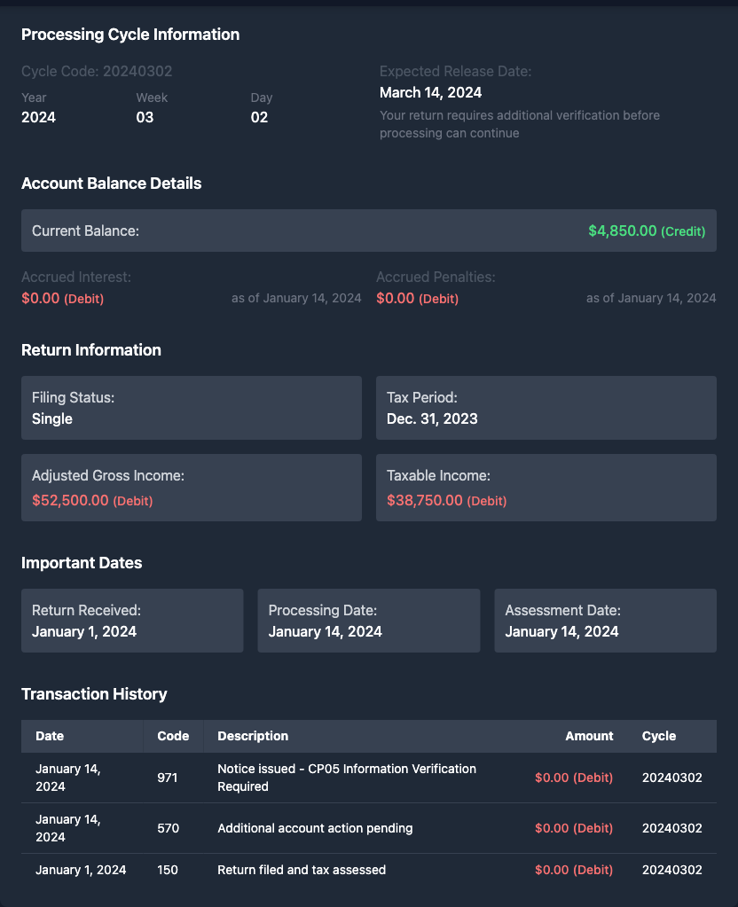 Hey everyone - instead of playing detective, I've been using taxr.ai and its amazing. It costs $4.99 but it analyzes your transcript and tells you exactly whats going on and when to expect your refund. Check it out here: https://taxr.ai