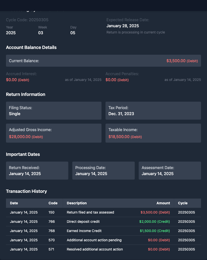 I filed my taxes early February and got all these codes on my transcripts that I don't understand. I just received my transcript today (04-23-2024) after requesting it yesterday. I've attached an image of my Account Transcript from the IRS and I'm completely confused. The transcript shows: Internal Revenue Service United States Department of the Treasury Request Date: 04-22-2024 Response Date: 04-22-2024 It's for Tax Period: Dec. 31, 2023 for Form 1040. My filing status shows as Head of Household, but then there's all these sections that say: ADJUSTED GROSS INCOME: [blank] TAXABLE INCOME: [blank] TAX PER RETURN: [blank] Then at the bottom it says "RETURN NOT PRESENT FOR THIS ACCOUNT" and under TRANSACTIONS it says "No tax return filed" with no cycle date or amount. My account balance shows $0.00, with $0.00 accrued interest and $0.00 accrued penalty as of May 07, 2024. I'm expecting a refund but this transcript makes it look like I never even filed! I definitely filed in early February - it's been over a month now and I'm getting really worried. Why would it say "No tax return filed" when I definitely filed? Does this mean they lost my return? Or is it still processing? Can someone help me read this and tell me what's going on with my refund? I don't understand all these blank fields and what "RETURN NOT PRESENT FOR THIS ACCOUNT" actually means.