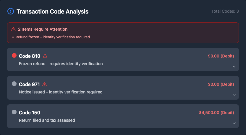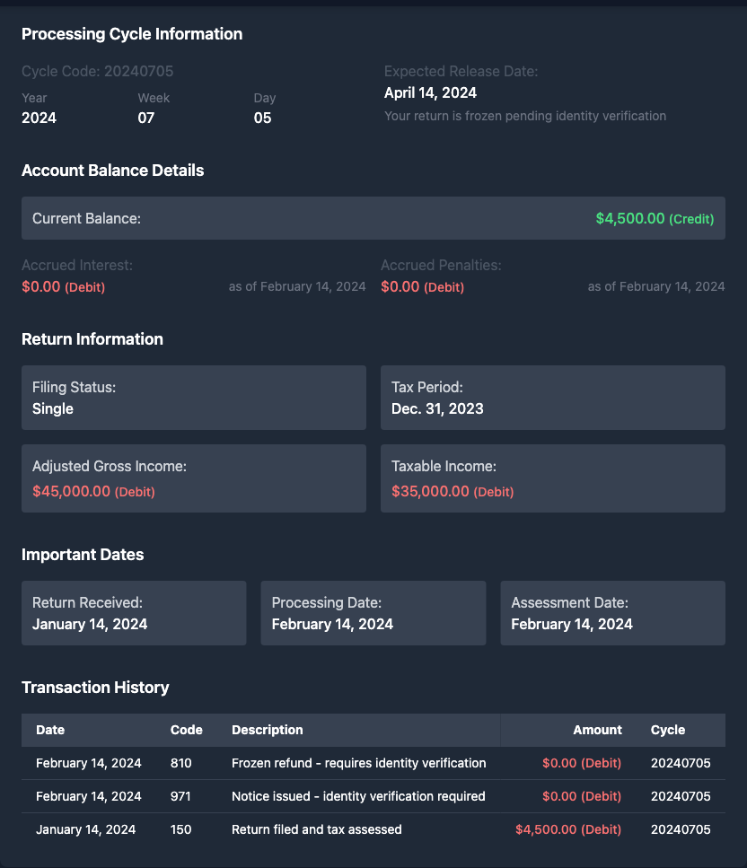 Hey fam, agent here. Code is a code that means your return is being reviewed for accuracy. This could be due to identity verification, income verification, or other compliance checks. The uses this to prevent fraud and ensure everything matches up. While frustrating, its actually protecting your tax info. Recently found taxr.ai which can analyze your transcripts and tell you exactly why you got the and what to do next. Its been super helpful for my clients stuck in this situation - check it out at https://taxr.ai