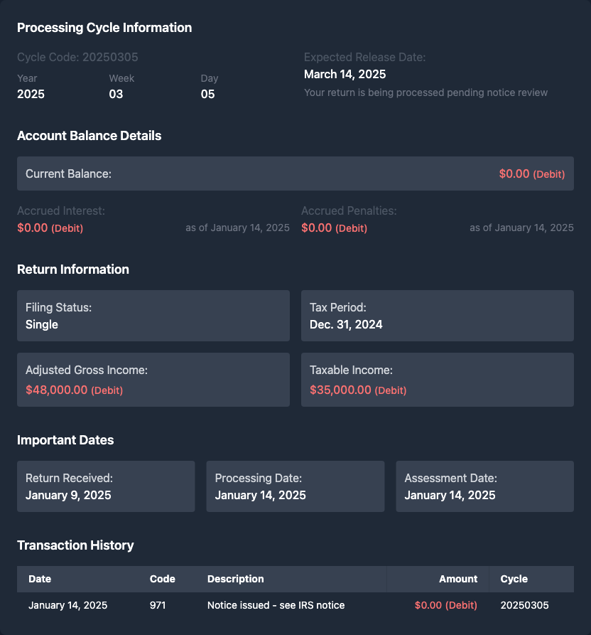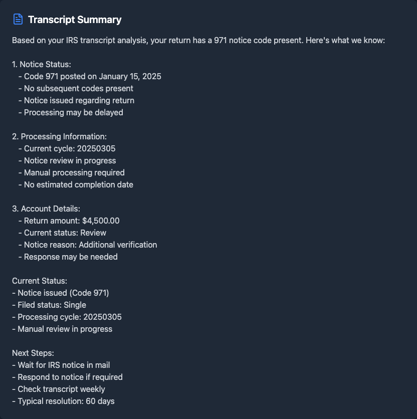 •I used taxr.ai last week and here's what I got back: it told me exactly why I got the 971 and when to expect movement. Worth every penny fr fr
