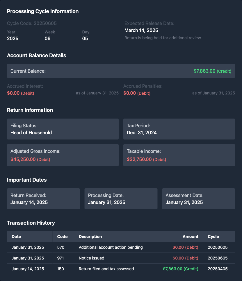 Your transcript shows you're due a significant refund of $7,863.00, filed as Head of Household with no taxable income for tax year 2024. The key dates and codes on your account tell an important story: The return was processed on February 24, 2025 (TC150, cycle 20250603), but there are two important subsequent codes: - Code 570 (dated 2/24): This is a hold on your account pending additional review - Code 971 (dated 3/3): Indicates a notice is being mailed to you While you have credits pending (codes 766 and 768 for earned income credit) dated April 15, 2025, the 570 hold needs to be resolved before these can be released. The good news is there are no penalties or interest accruing on your account as of March 3, 2025. The 570 hold is the key issue here - not the 971 notice. You'll need to wait for that notice to arrive to understand what additional information or verification the IRS needs. Sometimes these holds clear automatically, but you should be prepared to respond quickly if they request additional documentation to verify your filing status, income, or credits claimed. Important: If you don't receive the notice by mid-March, you may want to contact the IRS again for clarification on what's causing the hold.